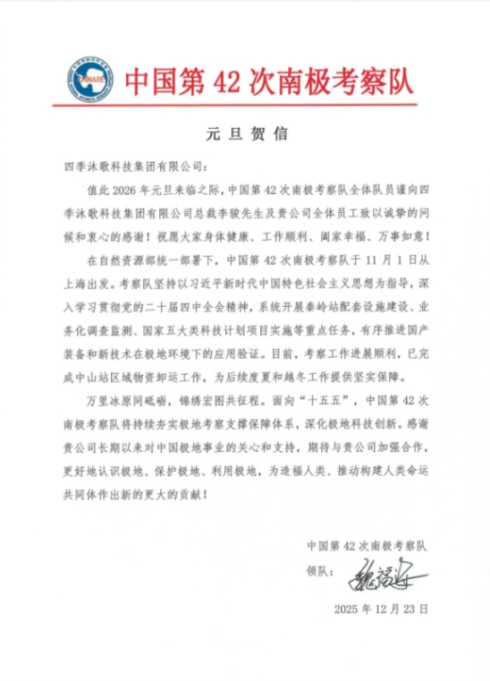 在元旦到来之际,远在南极执行极地考察任务的中国第42次南极科学考察队发来贺电,向四季沐歌集团致以诚挚的节日问候和衷心的感谢。贺电中称,本次考察队目前已系统开展秦岭站配套设施建设、业务化调查监测、国家五大类科技计划项目实施等重点任务,有序推进国产装备和新技术在极地环境下的应用验证。目前,考察工作进展顺利,已完成中山站区域物资卸运工作,为后续度夏和越冬工作提供坚实保障。